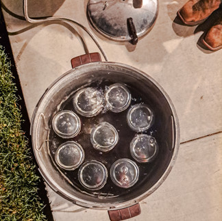 At last, it's time for the water bath! If using a turkey fryer burner like we do, carefully take the jars outside on a cookie sheet and set them down. Using a canning grabber, place each jar into the canner for a water bath, making sure there is enough water so that the entire lid is covered. Water bath for about 20 minutes. When they're done, carefully grab them with the canning grabbers.